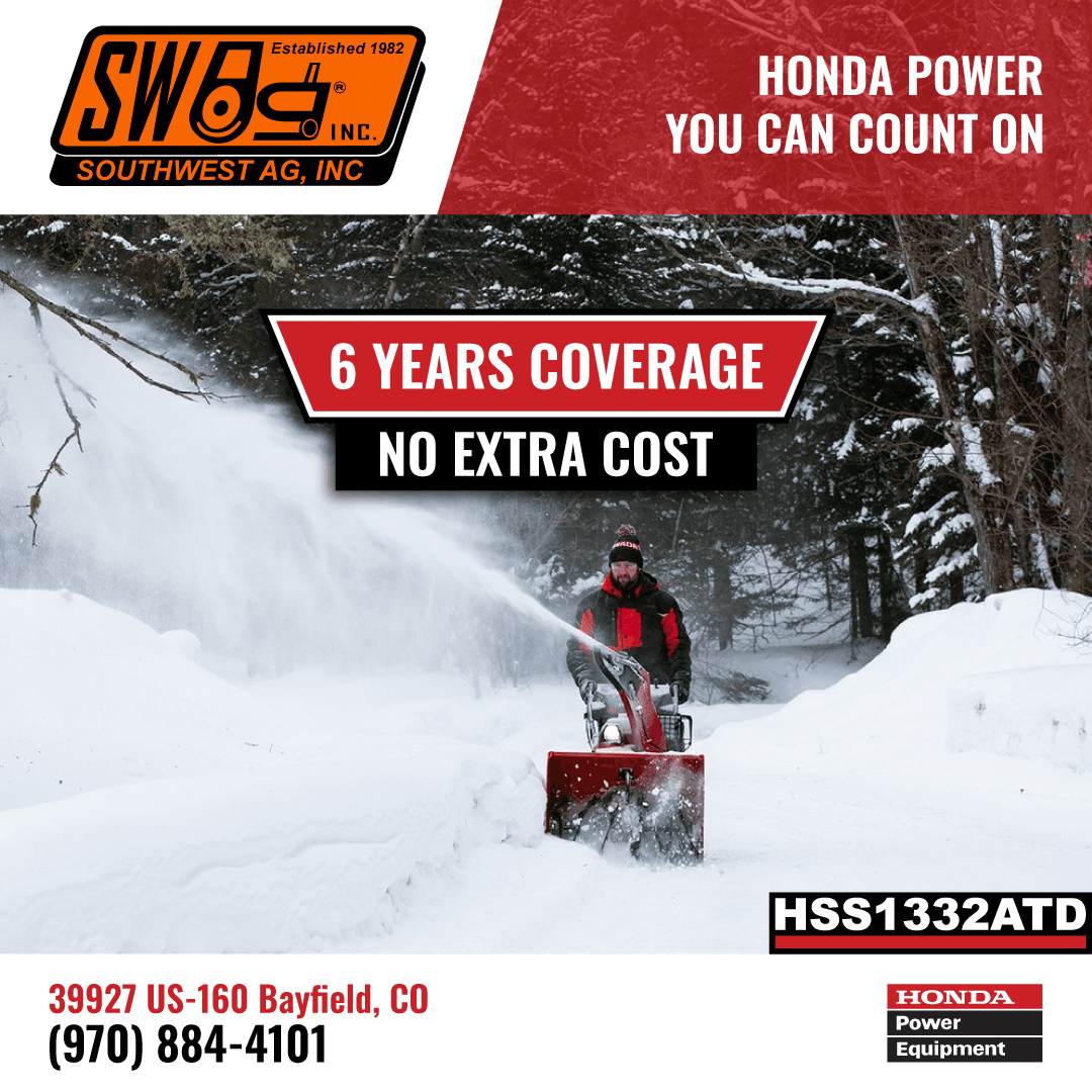 This winter, power through snow season after season with legendary Honda reliability — and now, even greater peace of mind. Through December 31, 2025, every qualifying HSS Series Honda snowblower comes with an additional 3 years of HondaCare® Protection Plan coverage at no added cost. That brings you to 6 years total coverage — a $420 value on the HSS1332ATD alone!