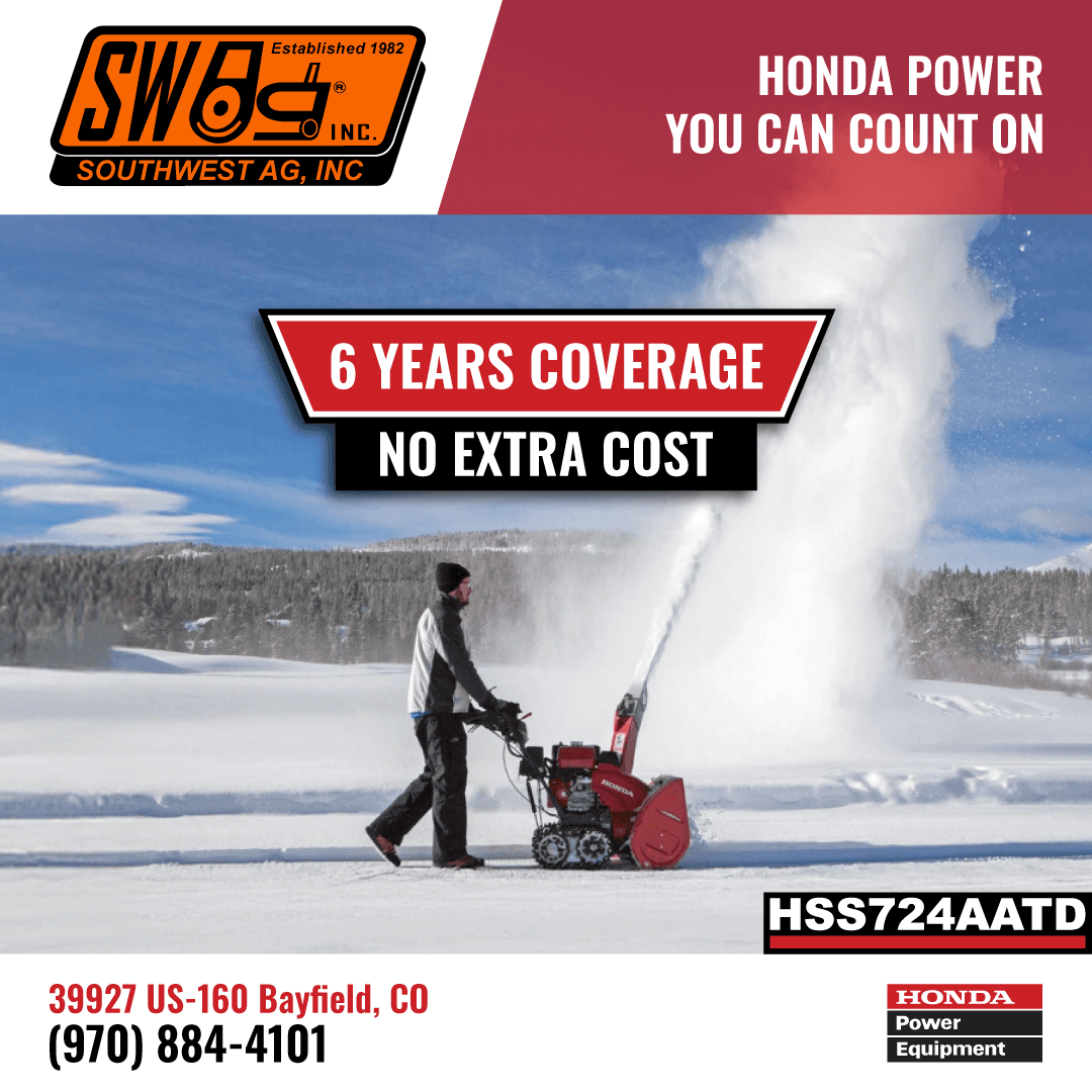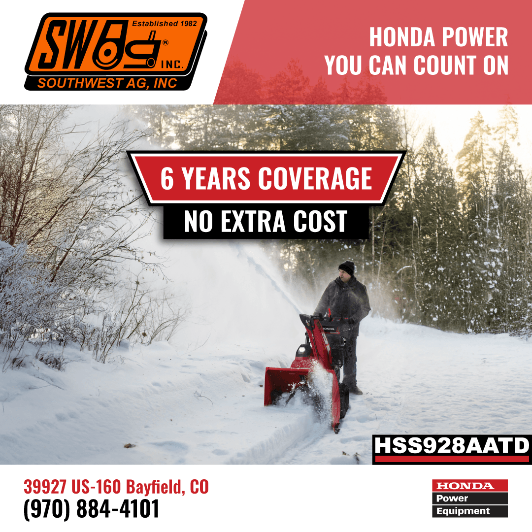 Purchase select Honda snowblowers by Dec 31, 2025, and receive a 3-year HondaCare® Protection Plan, free of charge. That’s 6 years total coverage, at no extra cost.